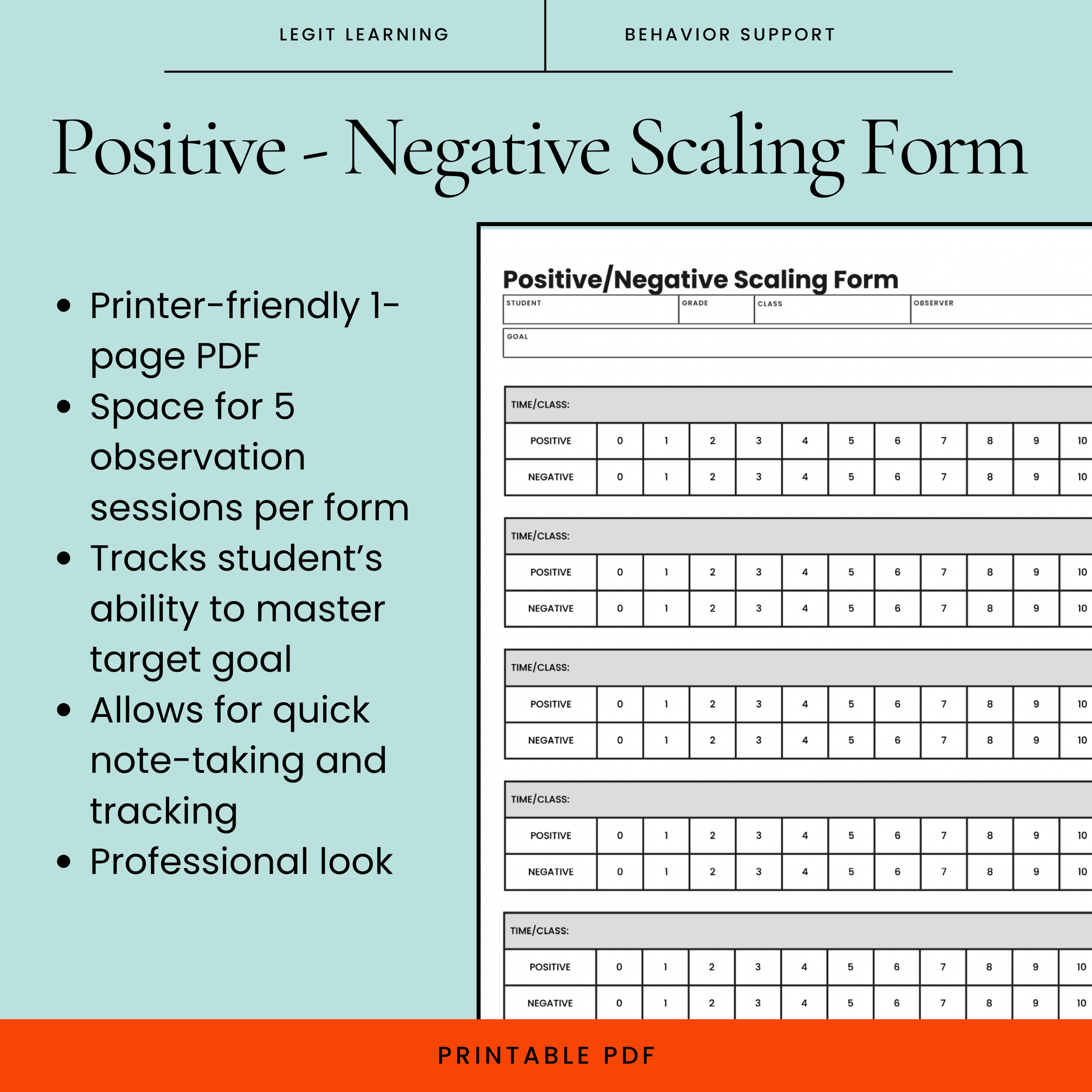 A Positive-Negative Scaling Form helps teachers and support staff record whether a student is demonstrating a target behavior (positive) or not (negative) during specific observation sessions. This quick, visual system allows you to collect measurable behavior data, monitor student progress, and share clear results with IEP teams and families.